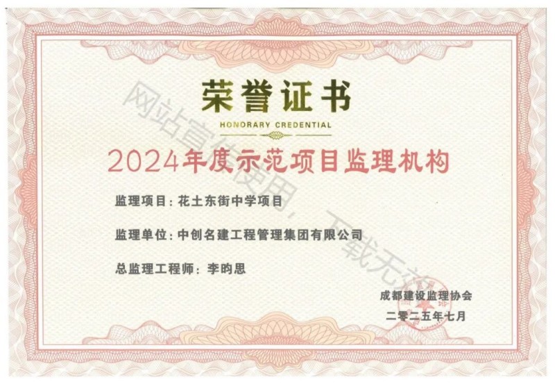 7月15日,成都建设监理协会公布2024年度成都市建设监理行业优秀监理企业、示范项目监理机构、优秀总监名单。集团公司获评2024年度成都市建设监理行业优秀监理企业。同时,集团监理项目“花土东街中学项目”被评为2024年度示范项目监理机构,该项目总监李昀思获评2024年度优秀总监。