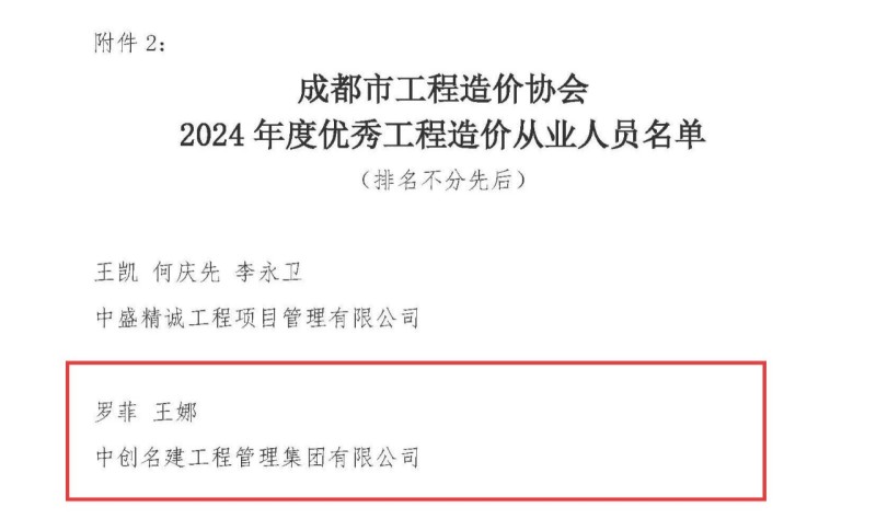 8月8日,成都市工程造价协会发布了《关于表彰2024年度优秀工程造价企业、优秀工程造价从业人员、优秀工程造价成果暨2025年度优秀联络员的通知》。中创名建工程管理集团有限公司(下称“集团公司”)荣获“2024年度优秀工程造价企业”称号,集团公司造价工程师罗菲、王娜获评“2024年度优秀工程造价从业人员”。同时,由集团公司承接的金阳县2024年度地质灾害综合治理竣工结算审核项目获评“2024年度优秀工程造价成果”三等奖。